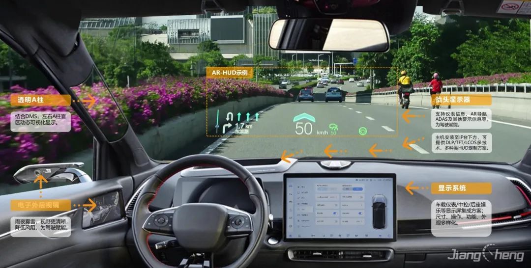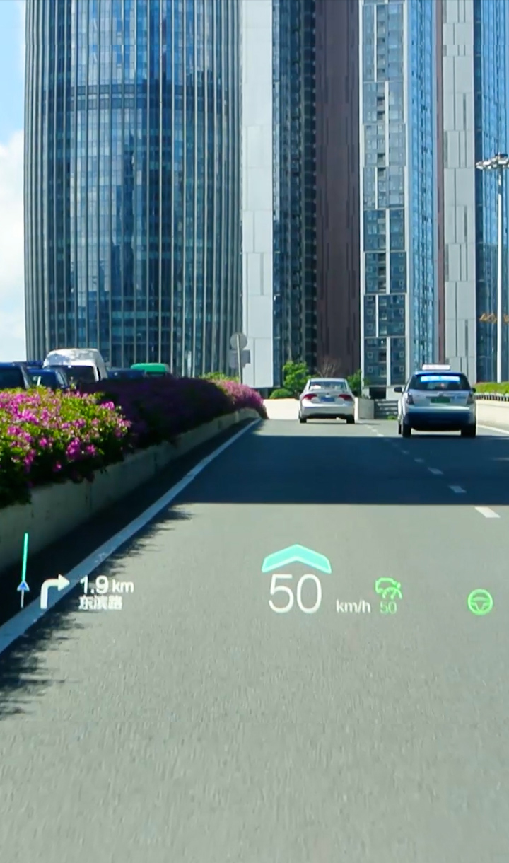 基于復(fù)雜變量環(huán)境完成大尺寸、小體積的光機(jī)設(shè)計(jì),并采用多數(shù)據(jù)融合算法實(shí)現(xiàn)導(dǎo)航、ADAS等輔助駕駛信息在真實(shí)路況上的疊加、融合顯示,提升駕駛安全性的同時(shí)給予更酷炫、更智能的駕駛體驗(yàn)。